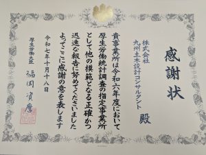 統計調査への協力が評価され、感謝状を受賞しました。